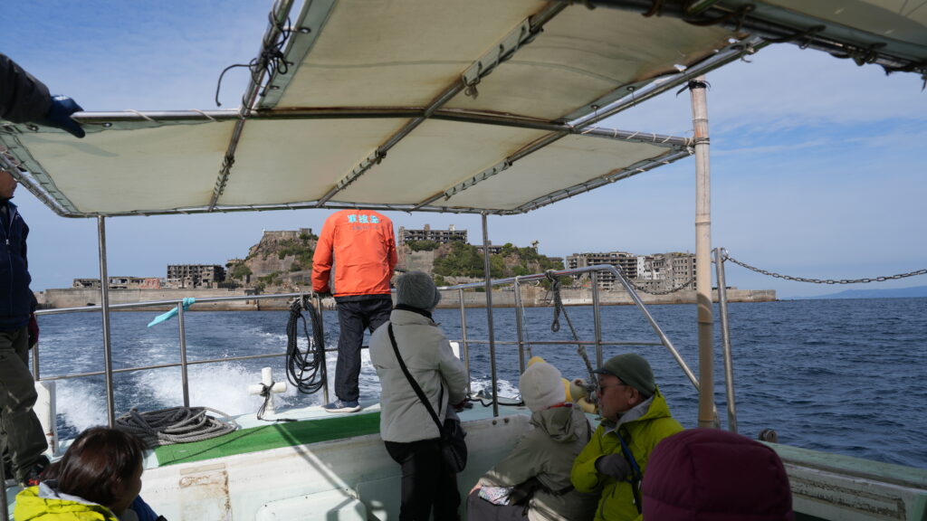一般的な軍艦島クルーズ(すべて許可制)は長崎港から出る中型船(40分)ですが、ベースキャンプがチョイスしてくれたのは個人経営の(許可済み)の小さな船
